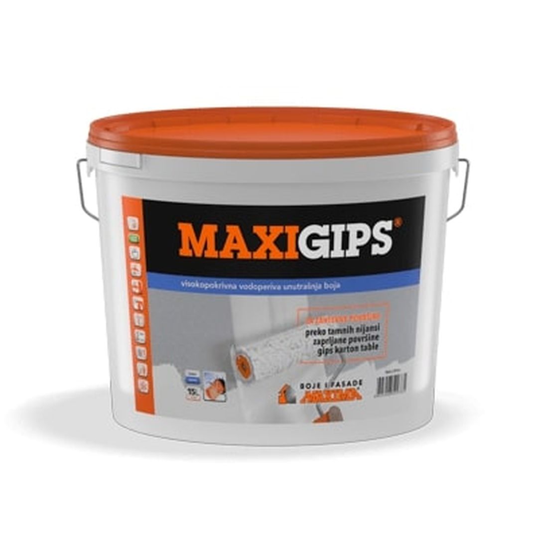 MAXIGIPS je kakovostna notranja disperzijska barva, posebej formulirana za barvanje zahtevnih površin, kot so: mavčno-kartonske plošče, umazane površine, preko temnejših odtenkov in povsod, kjer je izjemna prekrivnost nujno potrebna. Dobro se oprijema podlage, ima odlično prekrivno moč, izrazito belino, paroprepustnost in odpornost na mokro brisanje. Namena je za vse notranje visoko vpojne površine, kot so mineralne površine, in še posebej za mavčno-kartonske plošče, na katere se lahko nanaša neposredno, brez uporabe temeljnega premaza.